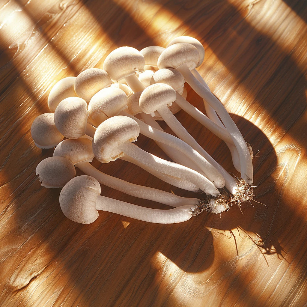 Los hongos White Beech destacan por su color blanco perla y su forma compacta, perfectos para saltear o incorporar en ensaladas frescas.
