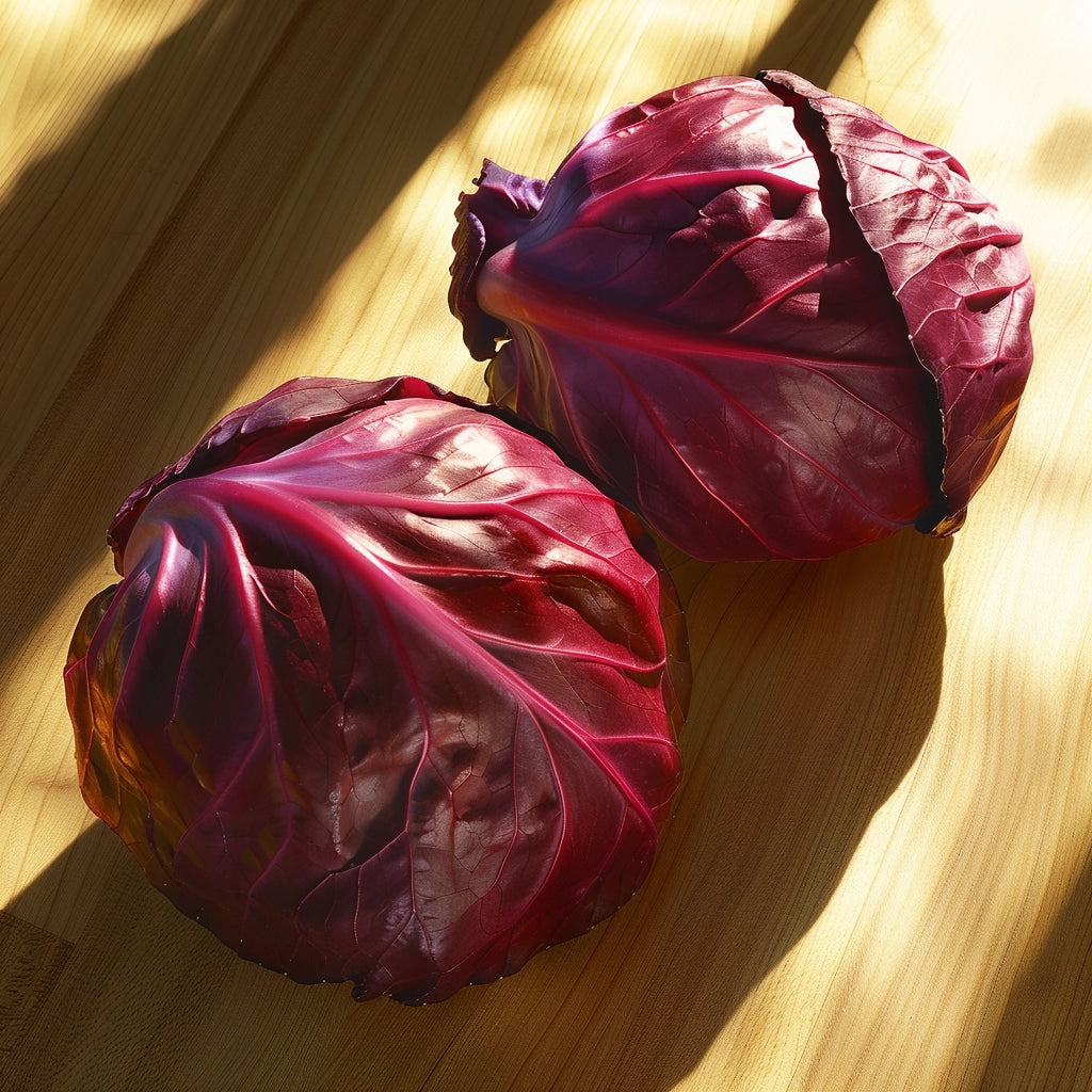 El repollo morado se distingue por sus hojas de color púrpura intenso, que forman una cabeza compacta y firme. Su textura es crujiente, y su sabor es más dulce y suave en comparación con el repollo verde. Es resistente y mantiene su color durante la cocción, lo que lo hace ideal para platos tanto crudos como cocidos.