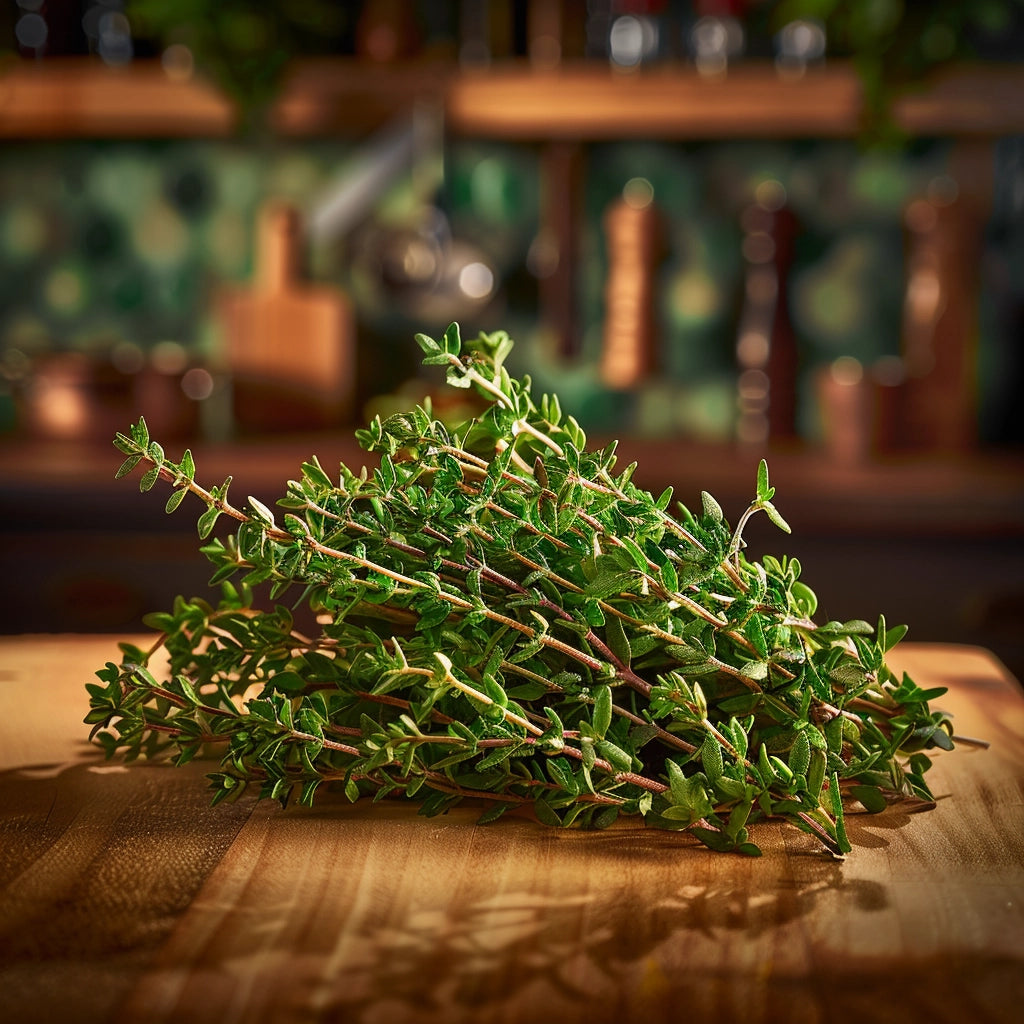 El tomillo es una hierba aromática que infunde a los platos con su sabor cálido y ligeramente terroso. Es un ingrediente versátil y esencial en la cocina, conocido por su capacidad de realzar y armonizar sabores en una variedad de recetas.